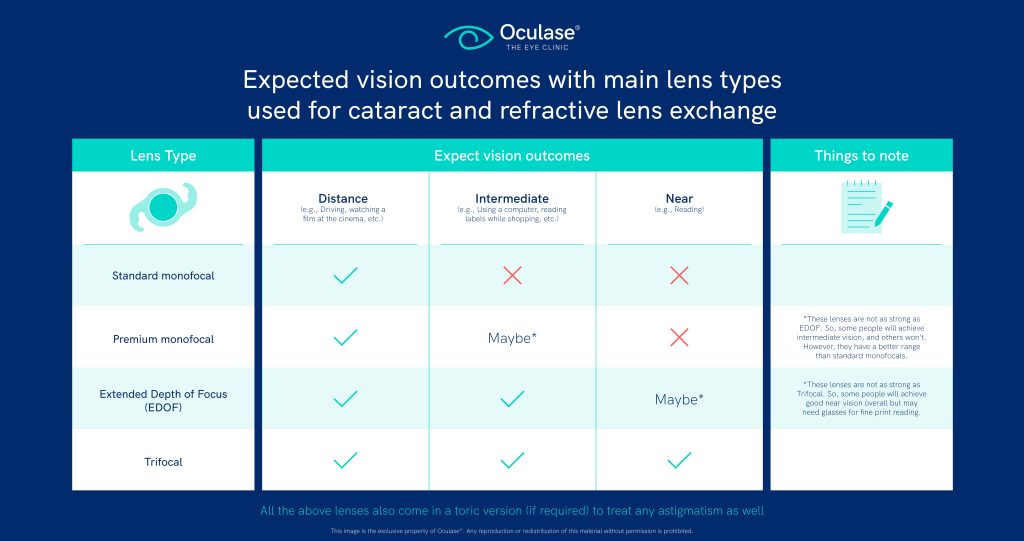 When replacing the eye’s lens during procedures such as refractive lens exchange or cataract surgery, many types of monofocal (standard and premium) and multifocal lenses (e.g. EDOF and trifocal) are available, each with various vision results.